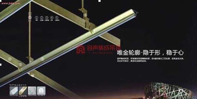 容聲集成吊頂率先采用全金鋼安裝結構,呈現(xiàn)金色光澤