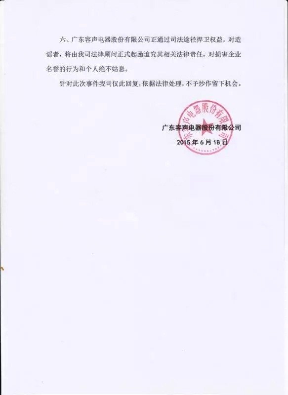 2015年6月17日,某微信公眾號(hào)刊發(fā)未署名帖子,惡意詆毀容聲集成吊頂。對(duì)于此文,廣東容聲電器股份有限公司已正式起函追究其發(fā)布者以及惡意傳播者的法律責(zé)任。