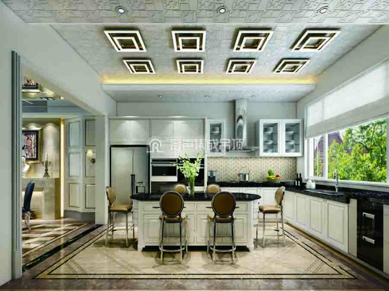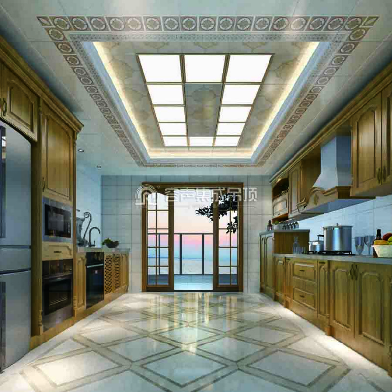 面板細線條紋與偌大的回字造型LED燈組合在一起,如凝聚了空間的生命力,形成強有力的視覺焦點;簡歐原木打造的廚房家具使整個廚衛(wèi)空間形成不拘一格的布局,悠然從容。