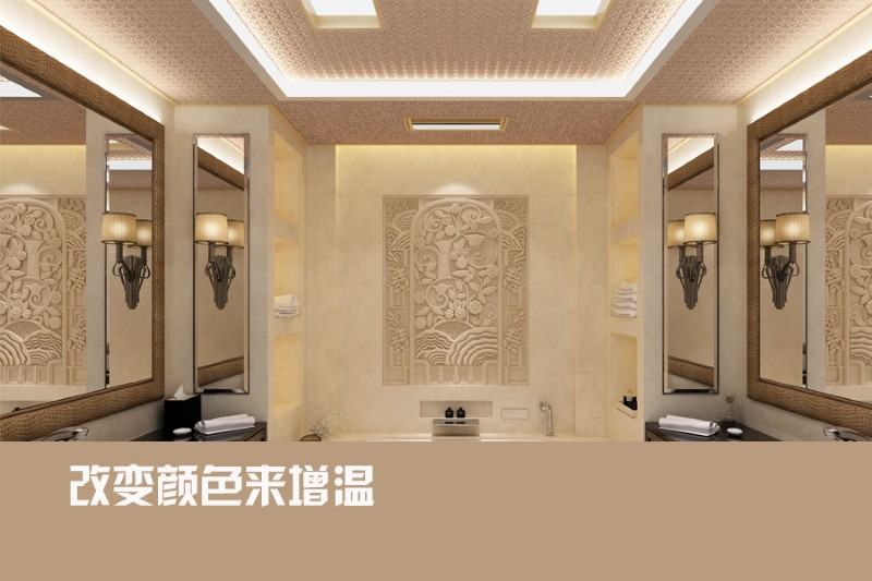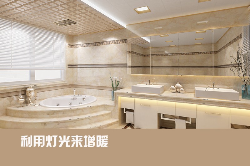 利用燈光來增溫:燈光也是改變浴室氛圍的重要工具。黃色的燈光都容易制造出朦朧、柔美的感覺,可以通過增加吊燈組數(shù)、增加壁燈射燈等氣氛燈,打造多重?zé)粼?。在更換燈光時,注意燈泡瓦數(shù),亮度不宜過低。同時可選擇漂亮適合的燈罩,讓浴室更具風(fēng)情。