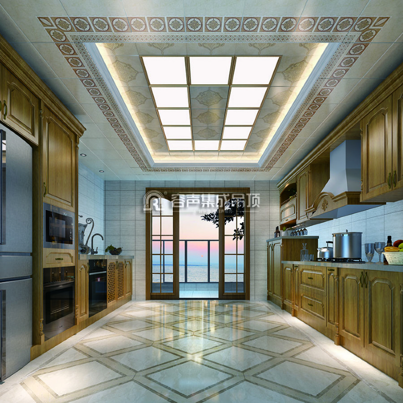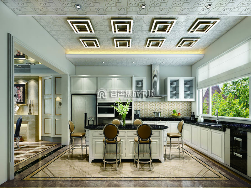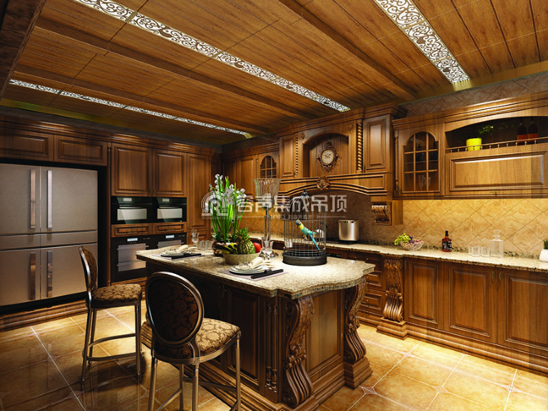 面板細(xì)線條紋與偌大回字造型LED燈組合在一起,如凝聚了空間的生命力,行程強(qiáng)有力的視覺(jué)焦點(diǎn);簡(jiǎn)歐原木打造的廚房家具使整個(gè)廚房空間形成不拘一格的布局,悠然從容。