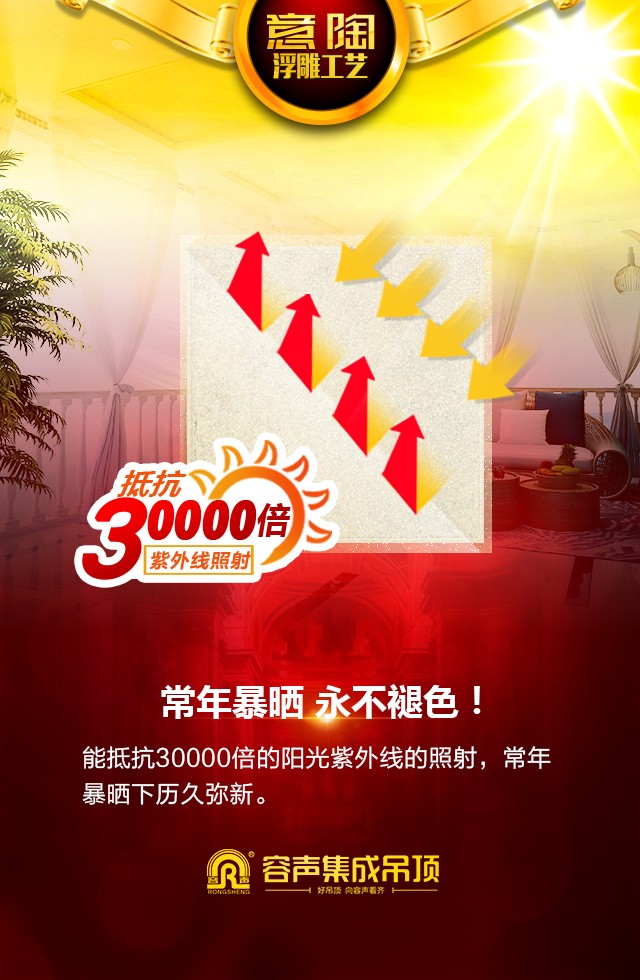 所謂意陶工藝即意大利陶瓷工藝,它是通過(guò)在油墨中加入陶瓷粉、半透明鉆石粉來(lái)達(dá)到增加表面印刷強(qiáng)度,采用800度高溫下4秒瞬間融注技術(shù)實(shí)現(xiàn)超強(qiáng)抗刮能力,讓扣板表面花色得以長(zhǎng)久保持,始終如新。另外,意陶工藝還可抗老化、抗紫外線,它能抵抗高于日常太陽(yáng)光30000倍紫外線的照射,做到太陽(yáng)底下長(zhǎng)年曝曬用不褪色。