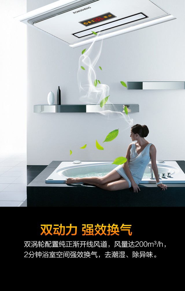 容聲集成吊頂速霸浴室暖空調(diào),擁有2780瓦大功率,雙核動(dòng)力,開(kāi)放式散熱結(jié)構(gòu),能達(dá)到1分鐘速熱!