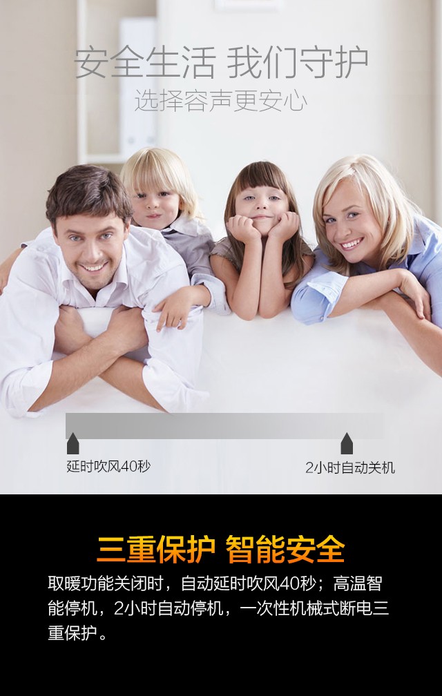 取暖功能關(guān)閉時(shí),自動(dòng)延時(shí)吹風(fēng)40秒;高溫智能停機(jī),2小時(shí)自動(dòng)停機(jī),一次性機(jī)械式斷電三重保護(hù)。
