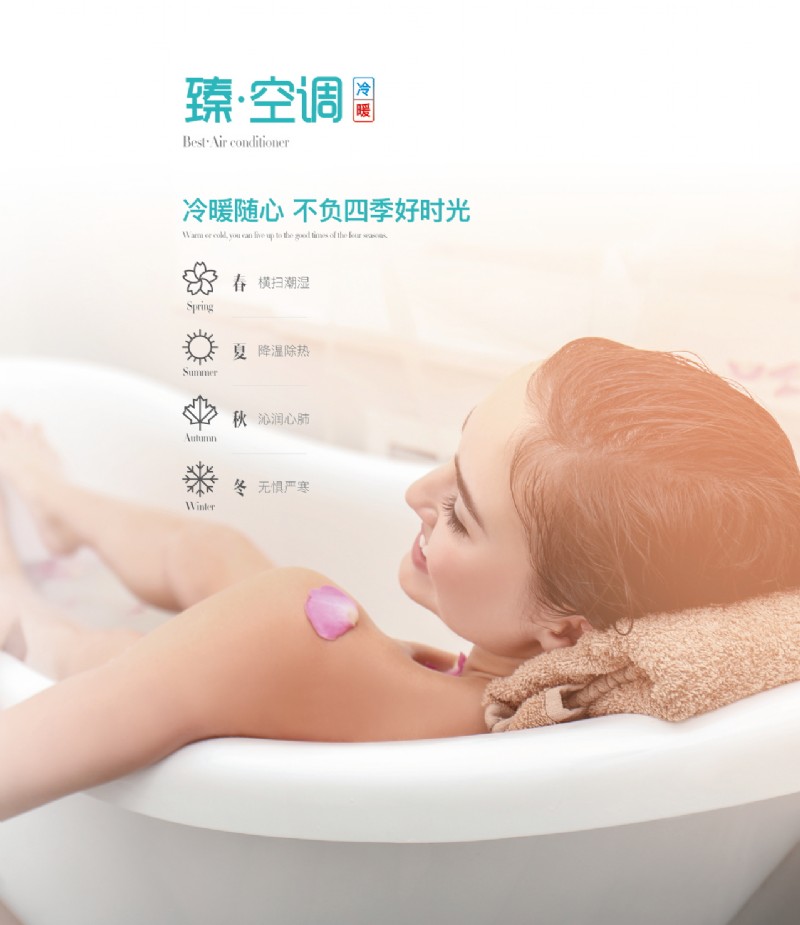 臻·空調(diào),冷熱雙效,廚衛(wèi)皆可享。廚房:強(qiáng)勁涼風(fēng),橫掃悶熱;衛(wèi)浴:均勻布熱,全屋速暖。一機(jī)多用,生活“臻”享受。