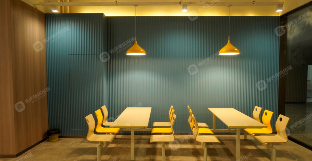 這家食堂主要選用了容聲無膠大板-淺木紋作為整個大堂的頂墻主基調(diào),與純白座椅、明黃吊燈和部分藍墻撞色搭配,清新自然,溫馨滿滿,光是看著就令人心情放松,胃口大開。