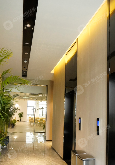 通往食堂的電梯口選用的則是石膏白無膠大板+射燈,同樣搭配淺木紋墻面,再擺上一盆綠植,從進門開始就給人以簡約清新的舒適感,將飯菜的油膩一掃而空!