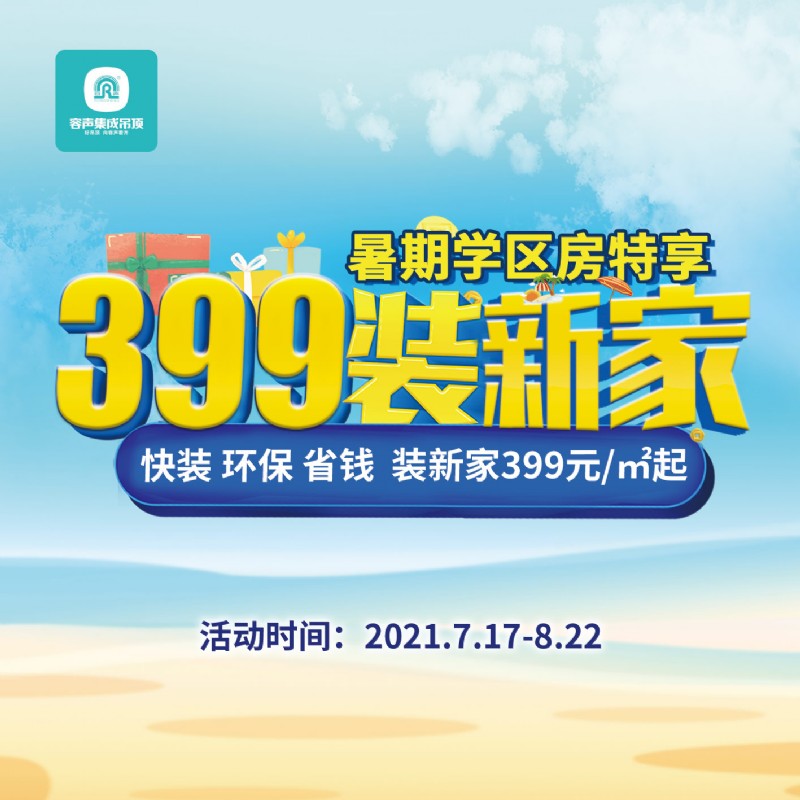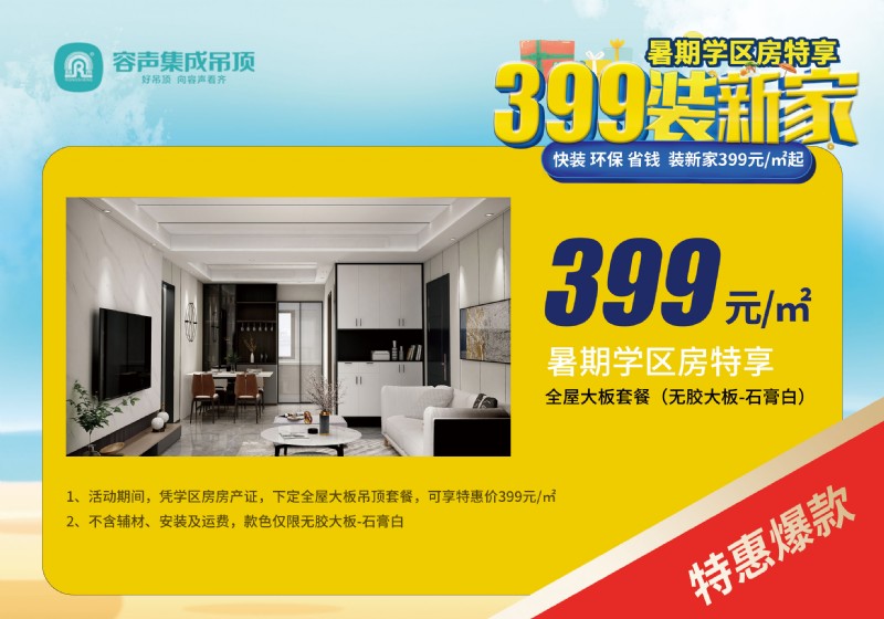 最適合在暑假進(jìn)行裝修的新房,莫過于學(xué)區(qū)房了——夏天散味快,施工時(shí)間長,暑假裝完,開學(xué)直接入住,豈不快哉!對(duì)此,本次活動(dòng)容聲特別推出了399元/㎡的暑期學(xué)區(qū)房特惠套餐,為廣大學(xué)子送福利!