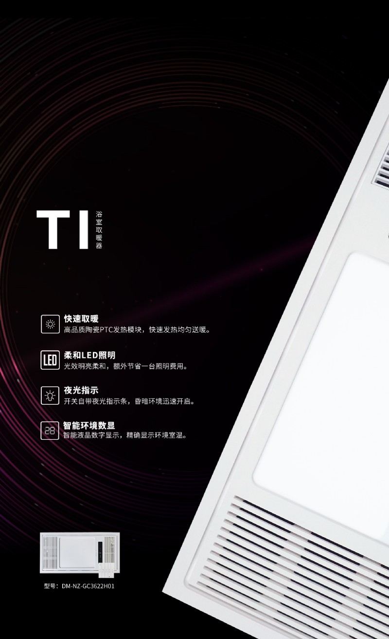 Z系列工程取暖則更為高端智能,擁有取暖、換氣、照明、溫顯、氛圍燈五大功能,面板設(shè)計美觀大氣,智能感十足,無論是扣板還是大板,都能完美適配,適用于中高端房企工程項目。