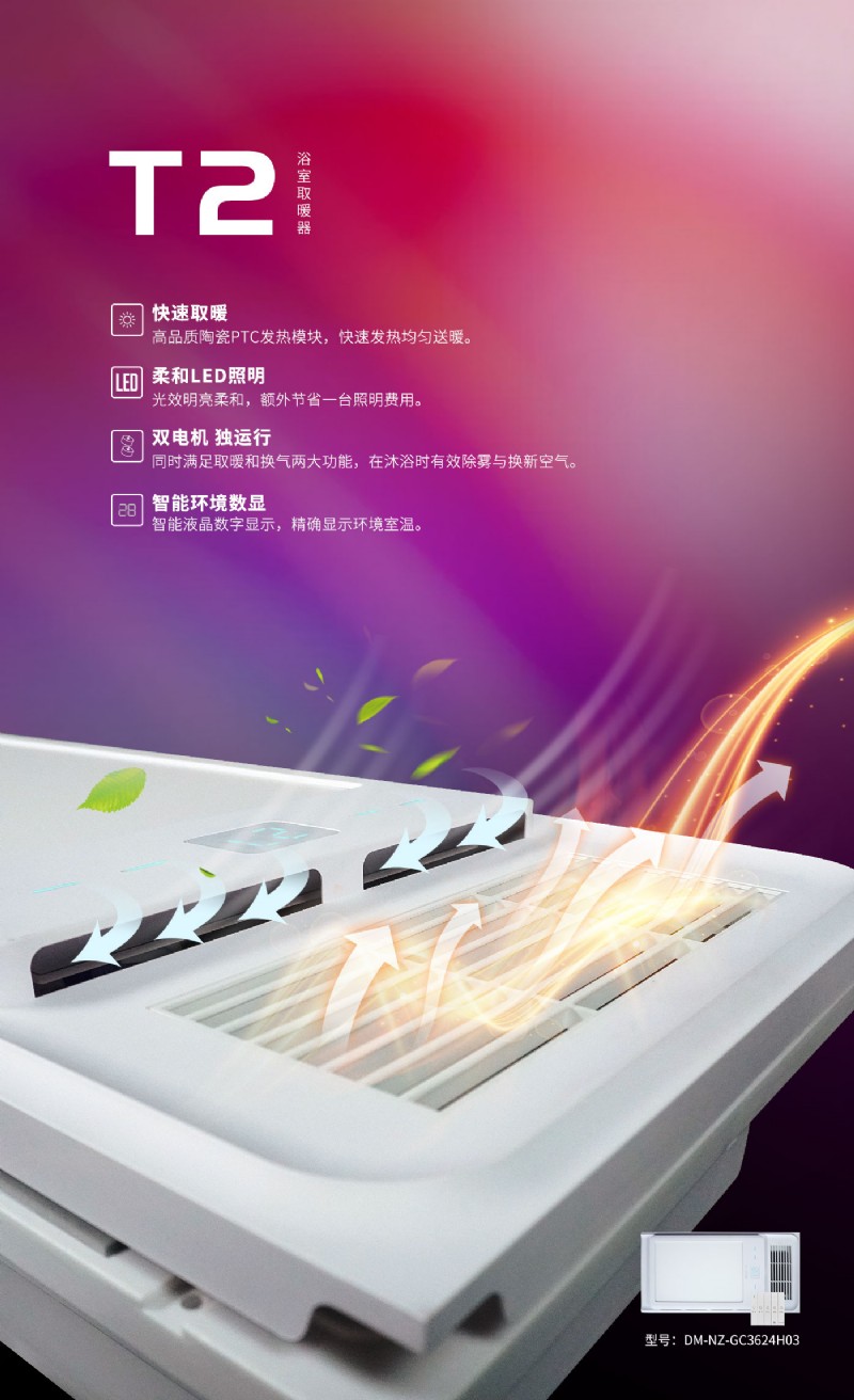 T系列工程取暖主打?qū)嵱冒俅?,配備了取暖、換氣、照明、環(huán)境溫顯四大功能,面板設(shè)計簡約大方,安裝適配各類扣板,適用于各類中小型工程項目。
