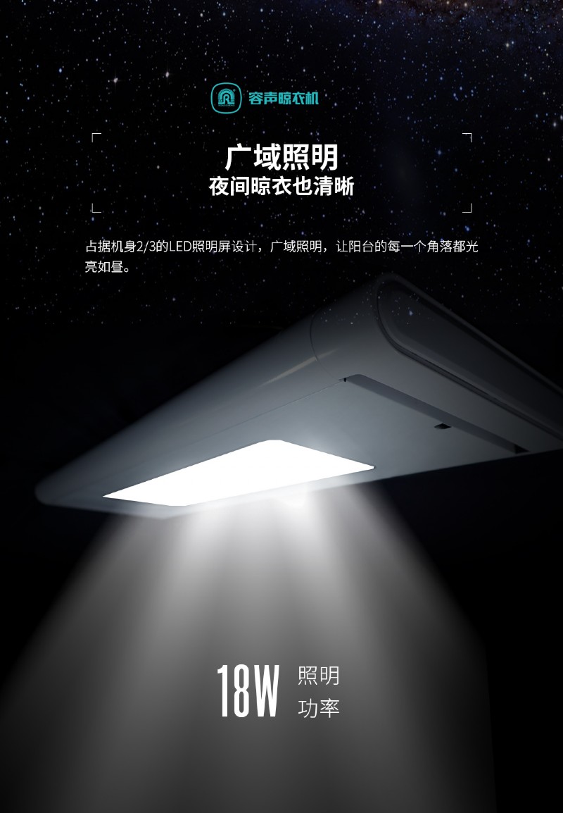 占據(jù)機(jī)身2/3的LED照明屏設(shè)計(jì),一體化密封工藝,防水防塵,廣域照明,為白天上班晚上才有空洗衣晾曬的人們提供亮如明晝的夜間晾衣環(huán)境。