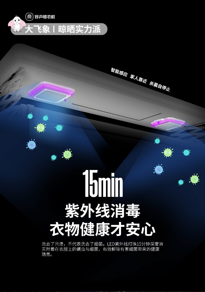 容聲大飛象高配款晾衣機(jī)配備了新升級(jí)的深紫外線(xiàn)殺菌燈,燈珠由中科院企業(yè)參與研發(fā)生產(chǎn),能有效殺滅螨蟲(chóng)、細(xì)菌、過(guò)敏源,除菌率高達(dá)99%!
