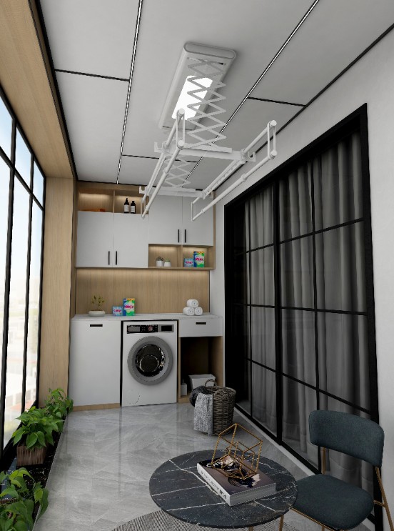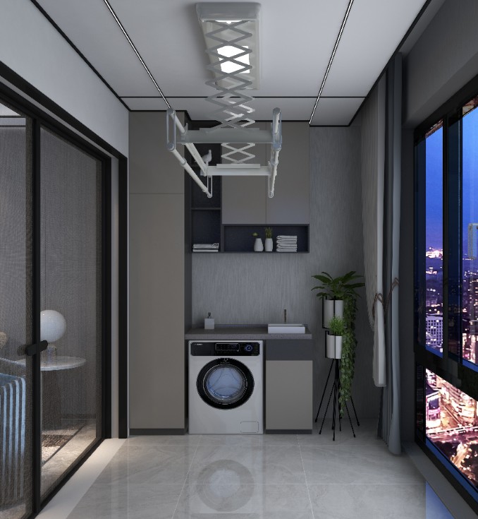 首先來說生活向的陽臺,即主要以晾曬和收納為主要功能的陽臺,這類陽臺基本是家庭使用首選,比起詩和遠方,切實的屋主們追求的是便利實用。這樣的話,陽臺設(shè)計就要以陽臺柜為主,嵌入洗衣機,增加晾衣架。