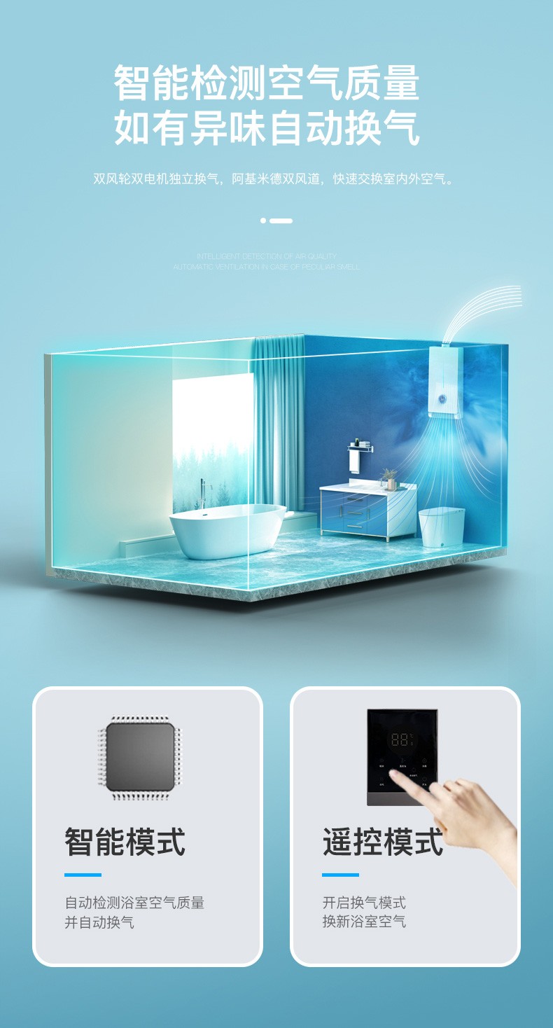 雙風(fēng)輪雙電機(jī)獨(dú)立換氣,阿基米德雙風(fēng)道,快速交換室內(nèi)外空氣,并可智能檢測(cè)空氣質(zhì)量,如有異味自動(dòng)換氣。