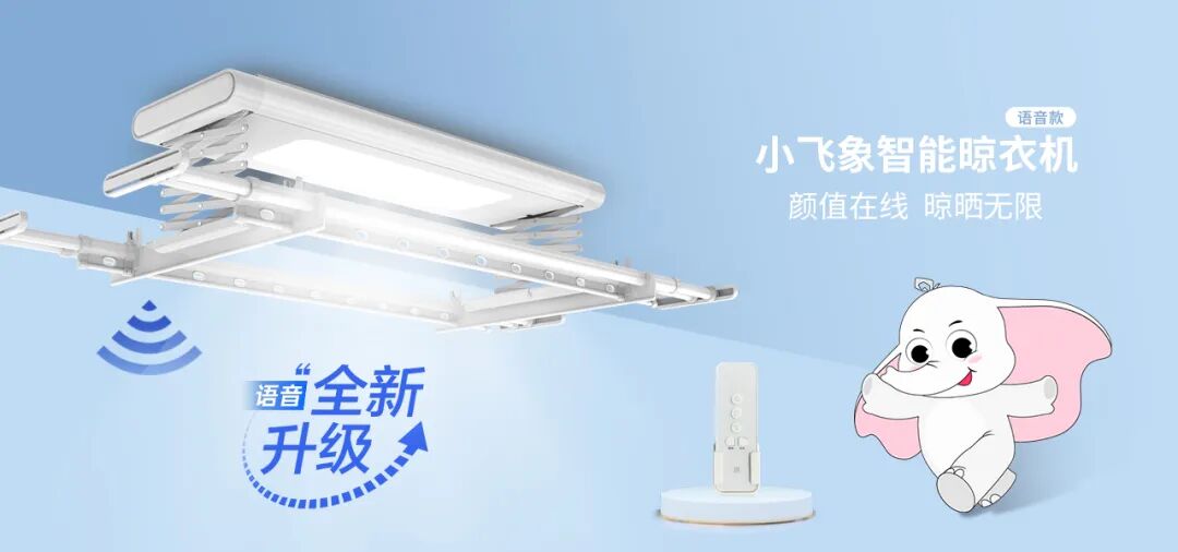 針對(duì)陽(yáng)臺(tái)空間,本次特意推出了爆款晾衣機(jī)小飛象的全新升級(jí)款——小飛象語(yǔ)音款!一聲“小易”,晾曬如此容易!