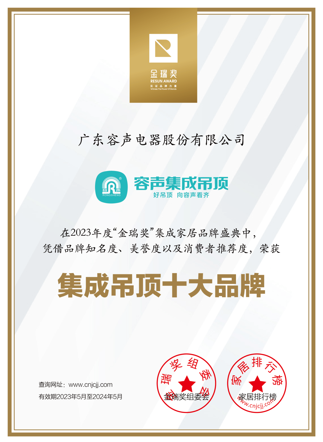 5月,金瑞獎(jiǎng)集成家居品牌頒獎(jiǎng)盛典隆重召開,容聲集成吊頂榮獲2023年度“集成吊頂十大品牌”榮譽(yù)稱號(hào) !