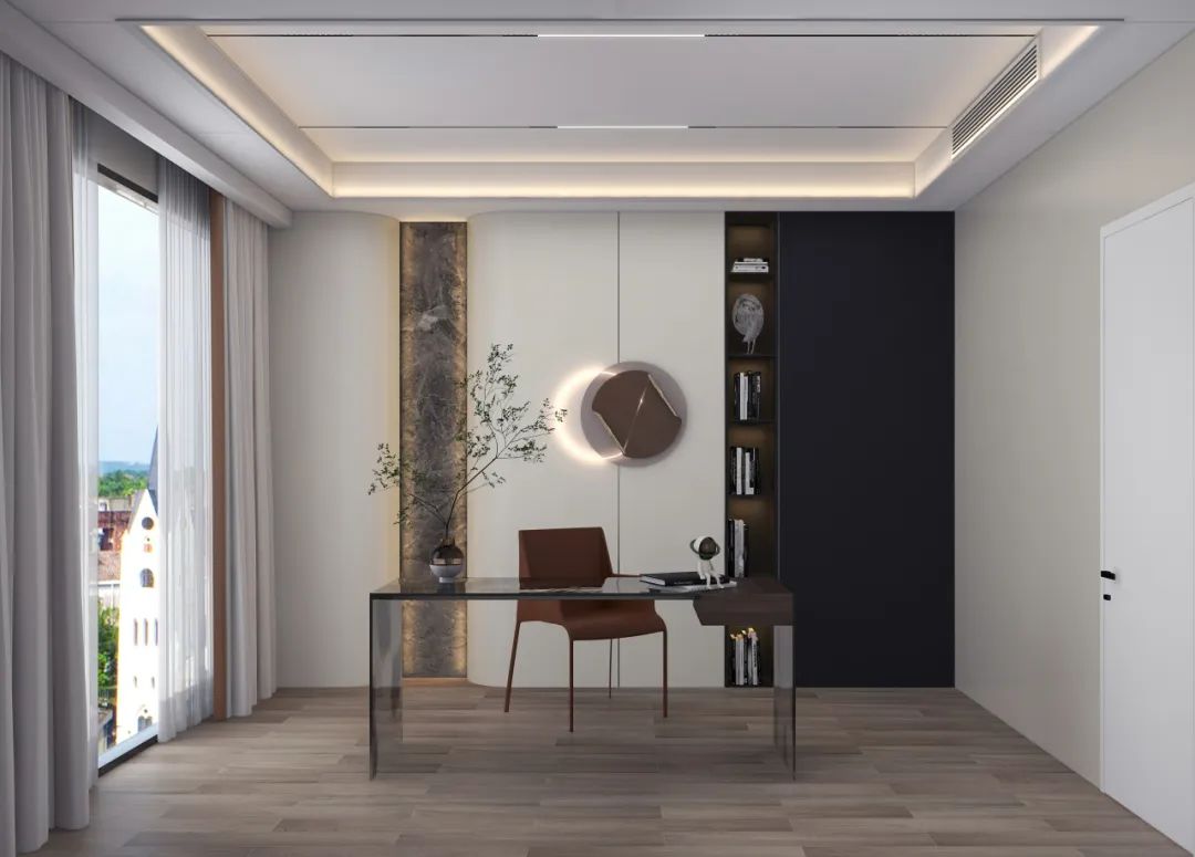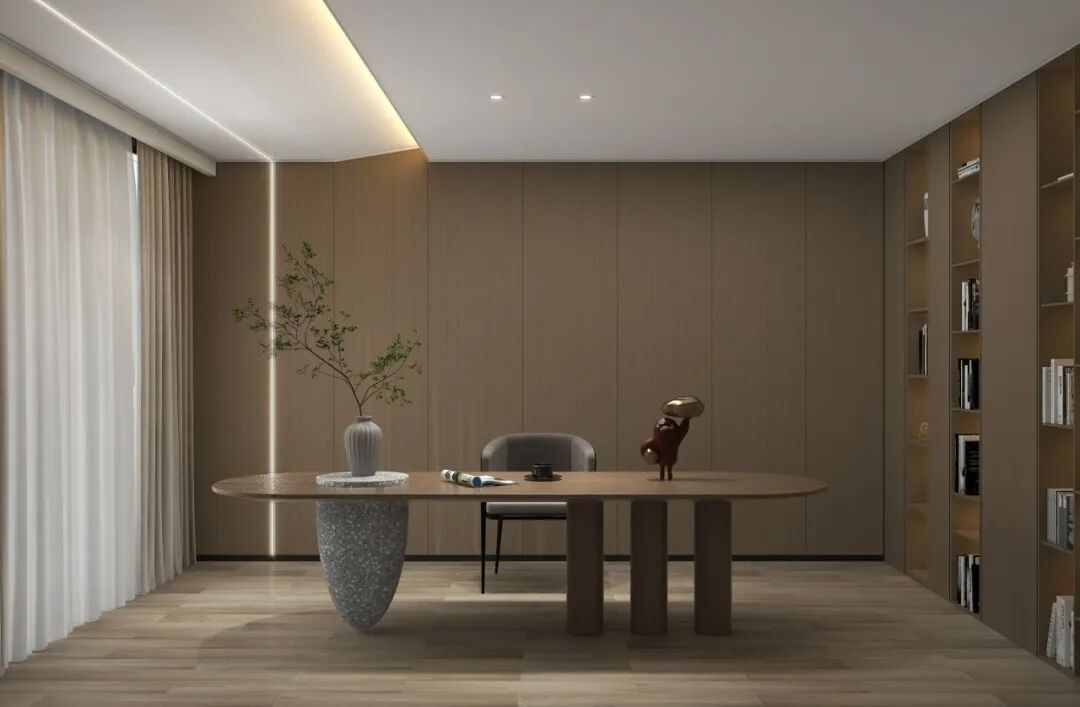 2、弧形造型+肌理感巖層背景墻,搭配燈帶營(yíng)造書(shū)房視覺(jué)亮點(diǎn);