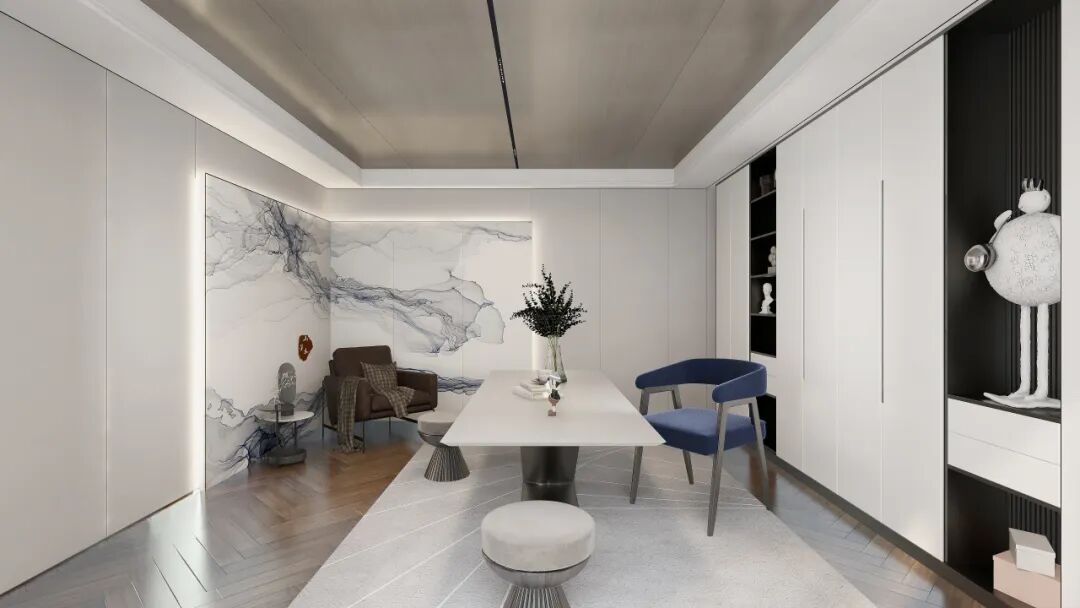 3、亞克力書(shū)桌與極簡(jiǎn)靠椅,增添空間設(shè)計(jì)感。