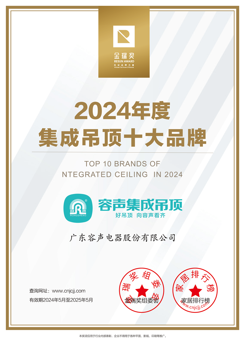 此次得獎是大眾對容聲品牌實力的認可,也是容聲邁向輝煌未來的新起點。未來,容聲集成吊頂也將繼續(xù)以“品牌發(fā)展為導向,以市場需求為發(fā)展理念”,加強產(chǎn)品革新,致力于成為全民信賴的集成吊頂優(yōu)質(zhì)品牌,為消費者打造舒適、美麗、健康的家居生活而不懈努力。